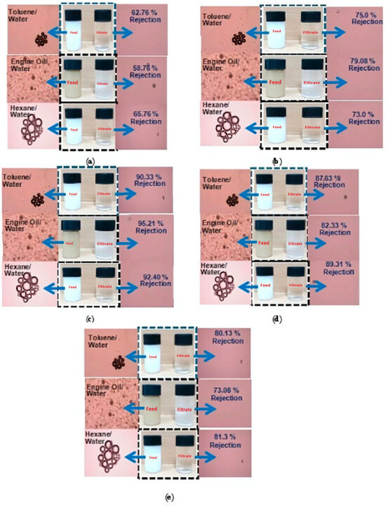 Figure 9a–e depict the visual representation of emulsion filtration for pure CA, and the hexane/water mixture represents the incorporated composite membrane. The results have clearly indicated that the hexane/water mixtures contained emulsions of CA, CA-PVP, CA-TiO2, CA-B, and CA-GO before and after filtration. In hexane/water mixtures, oil rejection values in CA, CA-PVP, CA-TiO2, CA-B, and CA-GO membranes were 65.76%, 73.00%, 92.04%, 95.02%, 89.33%, and 81.3%, respectively. In oil/water emulsions with hexane/water compositions, the oil rejection of membranes incorporating CA-TiO2 was greater than that of membranes incorporating other materials. The CA-TiO2-incorporated membrane employed for the filtration of oil in toluene, hexane, and engine oil mixtures with water had oil rejection values 90.33%, 92.4%, and 95.21% higher than those of neat CA and the other incorporated membranes. The increased attraction between the membrane surface and oil droplets might have been caused by the surface hydrophilicity, reduced interface, and incorporation of TiO2, resulting in a higher rejection of oil [66,67]. In the automobile industry, oils such as engine oils or tractor fluids have an even greater affinity for moisture. The emulsion is a cloudy oil/water mixture that is tightly bound with a little-to-no-separation tendency. From the obtained experimental outcomes, it was evident that a small amount of TiO2 in membranes efficiently resulted in 95% oil/water separation efficiency and effectively proved to be significant for the automobile industry to treat tightly bound oil/water mixtures due to the excellent wettability and pore size reduction of TiO2 nanoparticles.