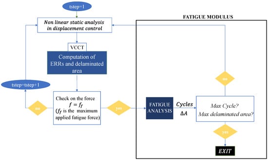 Figure 1 shows a flowchart illustrating the recently implemented methodology. In order to analyse a specific cycle, it is first necessary to subject the structural composite model, which has been previously damaged, to the appropriate boundary conditions and then perform a non-linear static FEM analysis under displacement control. The VCCT method allows for the evaluation of both the increasing delaminated area and the energy release rate. Once the non-linear analysis is complete, a check is made on the reaction force; if the reaction forces are equal to the applied forces during a fatigue cycle, the iterations are terminated. Otherwise, the applied displacements are increased and a new check on the resulting reaction force is performed. Once the reaction forces are equal to the applied forces (