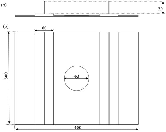 Double-T-stringers composite specimen (all dimensions have millimetres units). (a) Cross-section view; (b) frontal view.