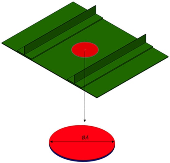 Figure 2 illustrates the graphical representation of the numerical test case used to evaluate the unstable propagation of delamination in composite structures. The test case serves as a benchmark for a typical aeronautical composite-stiffened panel with T-shaped stringers and a pre-existing artificial embedded delamination in the central bay. A variety of configurations have been contemplated, distinguished by different values of the delamination diameter (A) and depth.