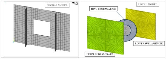 A parametric approach was employed using Ansys 18.0 software to construct the finite element models of the composite panels with two T-Shaped stringers and delaminations. In order to optimise the computational efforts, a global–local approach has been adopted for the delaminated area. In accordance with the global–local approach, a coarse mesh has been employed to represent the overall panel (global model), whereas a detailed mesh has been used for the delaminated region and the anticipated propagation area (local model). The global and local models have been connected through contact elements with multipoint constraints. The region containing the circular delamination has been modelled through two sublaminates: an upper and a lower one, joined by contact elements with life and death capabilities. These elements are strategically positioned on the ring of the delamination, where damage propagation is expected to take place, as illustrated in