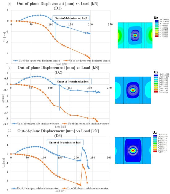Table 2 presents the onset delamination loads. It is evident that as the diameter of damage increases, the delamination initiation load is delayed. This phenomenon can be explained by evaluating the energy accumulated near the damage during the compression analysis. If the damage is minor, the possibility of deformation is reduced, and this energy must be released by detaching nodes between the laminate nodes. If the damage is extensive, the deformation possibility increases, as does the energy released during both deformation and detachment. Consequently, the onset delamination load is delayed. The damage growth versus load for D1, D2, and D3 configurations is reported in