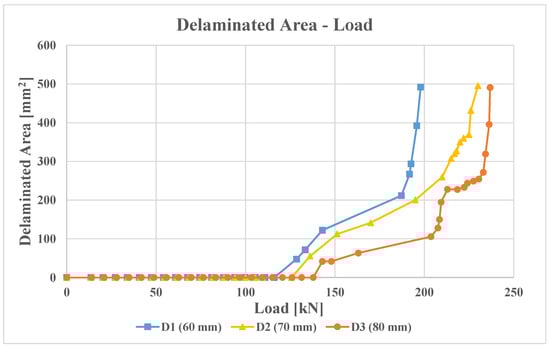 Figure 8. It can be observed that, as the damage propagates, the reaction loads increase, and the damage becomes unstable. Furthermore, for a given reaction load, the corresponding delaminated area is greater in the configuration with a smaller damage diameter.