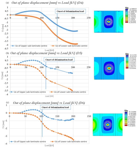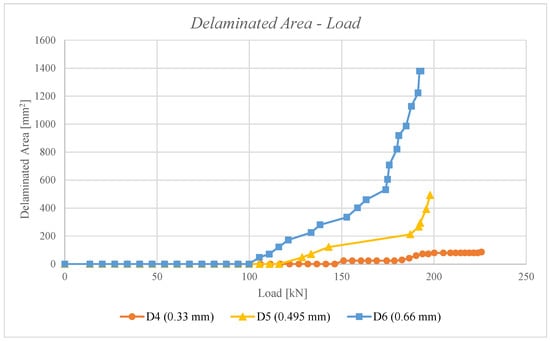 Figure 10 illustrates the damage growth versus load for the D4, D5, and D6 configurations. It can be observed that as the reaction loads increase, the damage propagation becomes unstable. Moreover, for a given reaction load, the corresponding delaminated area is greater for a configuration with deeper damage.