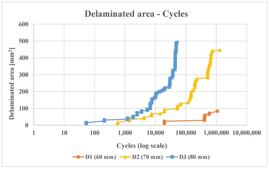 Figure 11 shows the evolution of the delaminated area as a function of the number of cycles during the fatigue analysis.