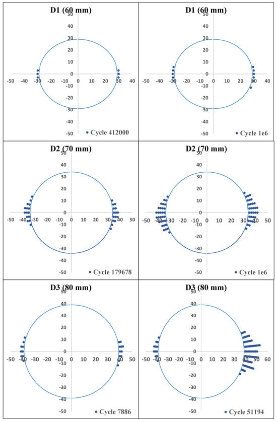 Figure 12 provides further insight into the asymmetrical nature of damage propagation in D3 by illustrating the damage evolution across cycle numbers for each configuration. The occurrence of static fractures in D3 serves to exacerbate the aforementioned asymmetric propagation pattern, in stark contrast to the comparatively stable and symmetrical growth observed in D1 and D2.