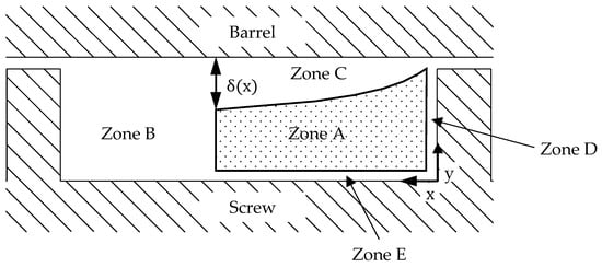 In [26], Pearson theoretically demonstrated that the assumption of a constant melt film thickness would lead to an unrealistically high-pressure gradient along the channel, thereby confirming the variable melt film thickness previously described by Donovan and Vermeulen. Building on his findings, Pearson et al. described a five-zone model for calculating the melting process in single-screw extruders [27]. The model is depicted in Figure 3. In addition to the increasing melt film thickness toward the melt pool (Zone C), it also accounts for the melt films on the passive flight (Zone D) and at the screw root (Zone E). The assumptions made in this model are more realistic than in most other models, as the melt films on the screw have also been observed in experiments. However, this also makes the model significantly more complex and computationally demanding.