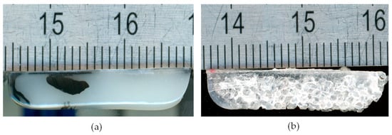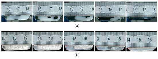 Cross-section samples along the melting zone. (a) HDPE. (b) PS. Scale in millimeters.