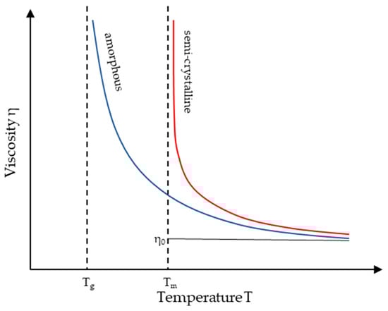 A key assumption of the model is the interface between the solid bed and the melt film, characterized by a sharp transition at the melting temperature for semi-crystalline thermoplastics, or for amorphous thermoplastics, as these are defined as the melting temperatures of the materials [33]. However, these temperatures do not represent a transition into a flowing state, as both semi-crystalline and amorphous thermoplastics are not sufficiently low in viscosity to flow at these temperatures. This is illustrated in Figure 7.