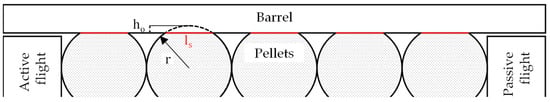 As depicted in Figure 9, the pellets have a limited contact area with the barrel, especially at the beginning of the screw channel. In this zone, heat input from the barrel primarily occurs through the contact area highlighted in red. In the schematic illustration, pellets are represented as circles. Based on this model concept, the contact area with the barrel can be determined by calculating the length of the chord, given a radius and an assumed overlap height . This calculation subsequently determines the contact area between the pellets and the barrel. Figure 10 demonstrates that the calculated contact area is highly dependent on pellet size and the assumed overlap height. Since the overlap is a conceptual model that does not exist in reality, is illustrated here with arbitrary examples of 0.01 mm, 0.05 mm, and 0.1 mm. The exact contact area is extremely difficult to determine theoretically. However, it can be observed that the contact area increases as the pellet diameter decreases.