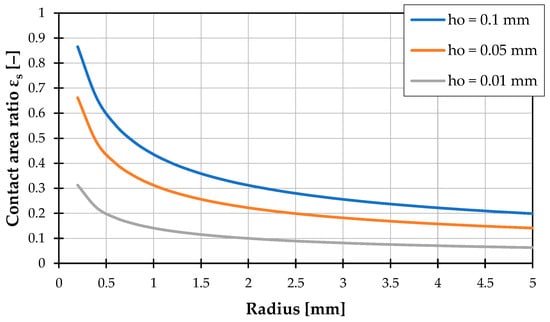 Dependence of the contact area ratio on the circle radius for different assumed overlap heights.