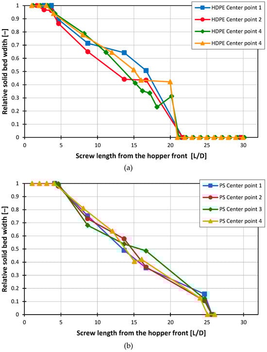 Melting profiles at 120 rpm, 2 mm pellet diameter, 200 °C barrel temperature using Screw 2 for (a) HDPE and (b) PS.
