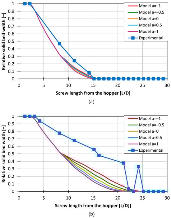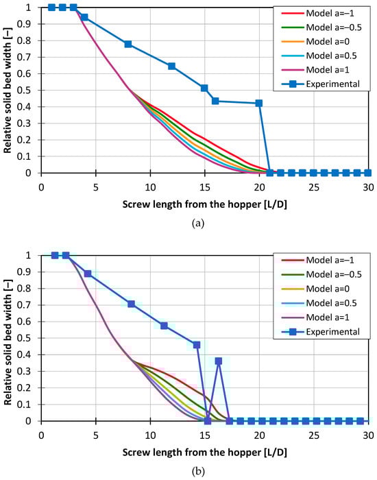 The solid bed dynamics within compression zones are theoretically modeled using the previously described exponent , which was defined in Equations (2) and (3). Given the challenges associated with measuring both the solid bed velocity and the density of the solid bed during the extrusion process, an empirical approach is adopted to account for the effect of solid bed dynamics on the melting process. The primary objective is to accurately predict the end of melting, which is crucial for effective process design. The investigation is conducted over a range from , which represents compression or a deceleration of the solid bed proportional to the channel depth, to , meaning an acceleration of the solid bed proportional to the change in channel depth. The comparison between the model and experimental investigations is carried out for the parameters , , , and .