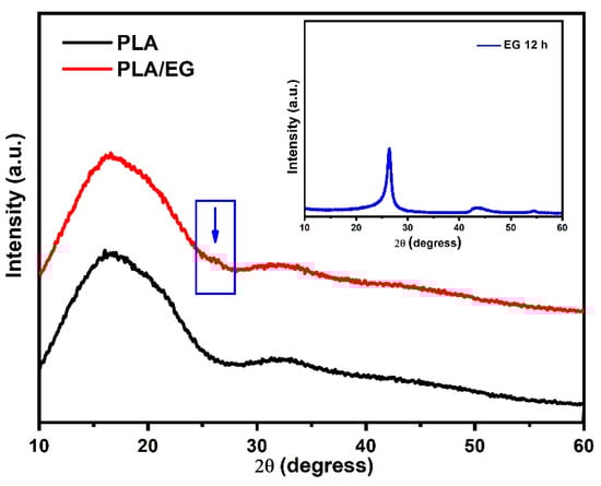 XRD standards of PLA, PLA/EG, and exfoliated graphite (EG).