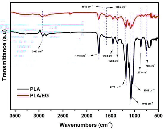 Figure 2 displays the Fourier transform infrared (FTIR) spectra of PLA and PLA/EG. The typical vibrational bands of PLA can be observed, including bending vibrations at 873 cm−1 and 758 cm−1, corresponding to its amorphous and crystalline phases, respectively. The bands at 1095 cm−1 and 1043 cm−1 are attributed to the symmetric and asymmetric stretching of C–O–C and CH3 groups, respectively. Additionally, the band at 1748 cm−1 is related to C=O stretching in the ester group, while the band at 2922 cm−1 corresponds to CH stretching.