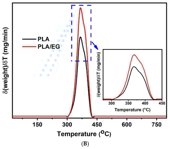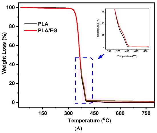 Thermogravimetric analysis (TGA) curves are shown in Figure 3A for both PLA and PLA/EG. The initial degradation temperature of both materials was approximately 255 °C, and by 340 °C, the mass loss was over 70%. The final degradation process concluded around 426 °C, in agreement with studies by Abdullah et al. [27], Guo et al. [28], and Jalali et al. [29]. Regarding the initial degradation temperature and the maximum temperature at material loss (PLA/EG), the addition of exfoliated graphite to the polymer leads to a mild improvement in the thermal behavior of the composite (inset Figure 3A) when compared to PLA. Przekop et al. [26] and Guo et al. [28] also observed such phenomena in their studies and described that the addition of carbonaceous material (reinforcement) can lead to a delay in the thermodegradation effect for the polymer (matrix), which is attributed to the protective effect provided by the reinforcement.