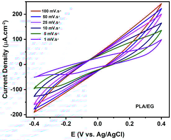 The slopes (peak current and v, which is the scan rate) of the composite (PLA/EG) determine the diffusion rates with surface redox reactions occurring in charge storage processes, according to Silva et al. [33]. Therefore, the rates of anodic/cathodic reactions on the surface of the PLA/EG composite confirm that the Faradic reactions occur on the electrode surface (Figure 5). It is observed that with the decrease in the scan rate, there is more time for the ion diffusion through the electrode, and the calculated specific capacitance at 1 mV.s−1 was 5.97 F.g−1. As the scan rate increases, the diffusion of ions becomes limited, resulting in a lower diffusion capacity. This behavior is described in the study by Araújo et al. [34].