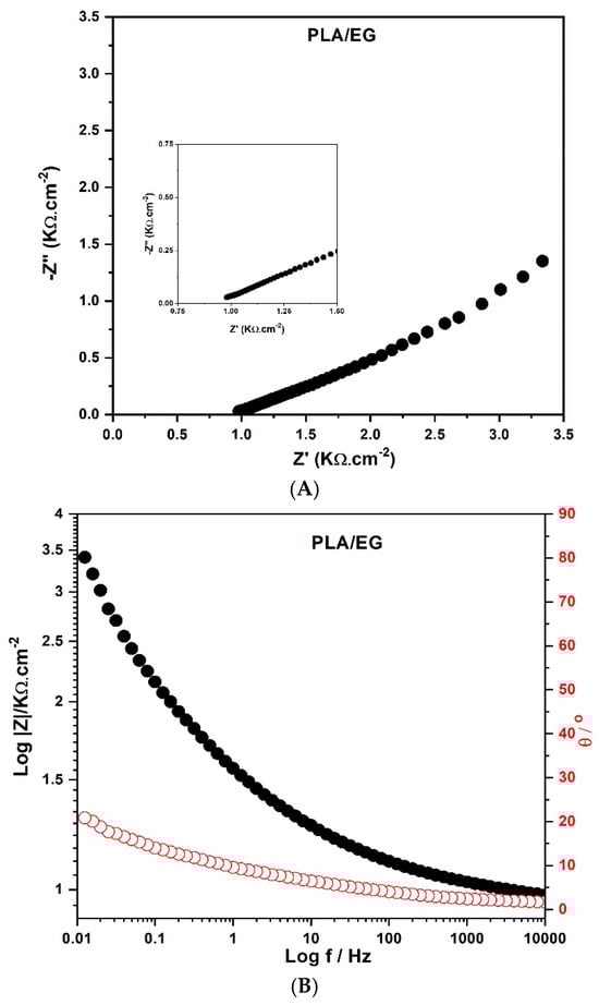 The complex studies conducted in this work provided valuable insights into the ionic and diffusional contributions of the PLA/EG composite within the electrochemical system. These results were consistent with those obtained through Nyquist and Bode plots (Figure 6A,B), confirming the electrochemical responsiveness of the composite. Such behavior makes the PLA/EG composite a promising candidate for applications as electrodes in electrical and electronic devices. Additionally, the findings suggest that the employed methodology is both cost-effective and practical.