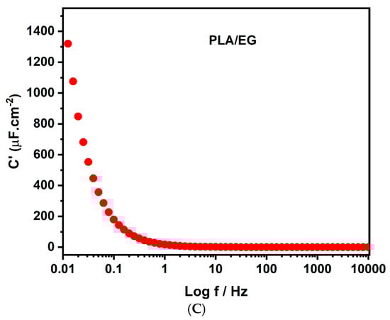 (A) Electrochemical behavior according to EIS via Nyquist; (B) electrochemical behavior according to EIS via Bode; and (C) real part of the complex capacitance C’(ω) of PLA/EG.