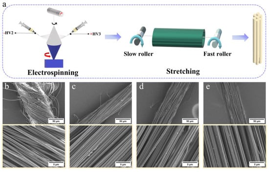 High-strength nanofiber yarns were prepared as illustrated in Figure 1. First, a spinning solution with a concentration of 15 wt% was loaded into a syringe equipped with a metal needle to generate charged fibers under the influence of a high voltage. These fibers were then deposited into a rotating funnel, which slowly drew them into a coiled collector. During this process, nanofiber yarns were formed (Figure 1a). High-strength nanofiber yarns were obtained by stretching the nanofiber yarn at temperatures of 130–160 °C. The purpose of thermal drafting is to allow the fibers in the yarn to slip and align along the yarn. At the same time, stretching above the glass transition temperature can change the crystallinity of the yarn, which helps to improve the strength of the yarn. The high-strength nanofiber yarns were labeled SR x, where x represents the ratio of stretch. As the stretch ratio increases, the number of bent fibers in the yarn decreases significantly, the fibers gradually straighten (Figure 1b–e), and the fibers tend to be oriented along the axial direction of the yarn (in the yellow frame).