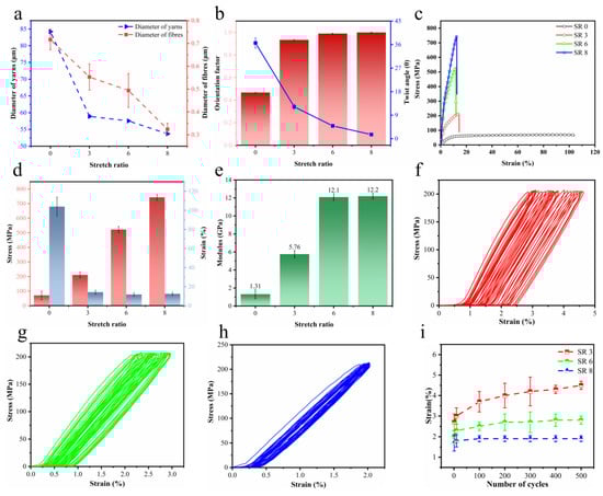 (a) Diameter of the yarns and nanofibers at SR 0, SR 3, SR 6, and SR 8. (b) Alignment factor and twist angle of yarns at different SRs. (c) Mechanical properties, (d) tensile strength and (e) modulus of yarns at different SRs. Stress/strain curves of yarns at (f) SR 3, (g) SR 6, and (h) SR 8 under maximum stress of 200 MPa for 500 cycles. (i) Changes in strain with different SRs over 500 cycles.
