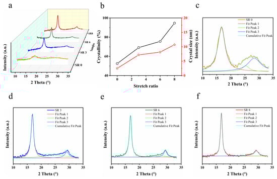 (a) WAXS spectra of yarns with different stretch ratios. (b) Dependence of the degree of crystallinity and crystallite size of yarns (corresponding to Figure 3a) as a function of the SR. The fits of yarns at (c) SR 0, (d) SR 3, (e) SR 6, and (f) SR 8.