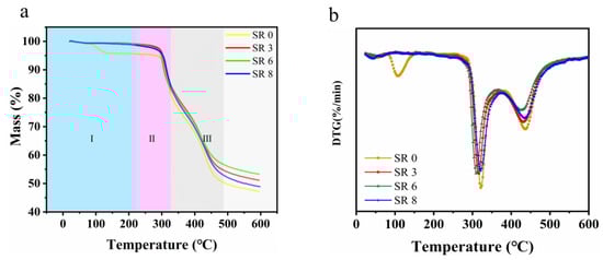 The TGA and DTG curves, obtained at a heating rate of 10 K/min under a nitrogen atmosphere, are presented in Figure 4. Based on weight loss across different temperature ranges, three distinct phases can be identified in Figure 4a. TGA parameters, such as the initial decomposition temperature and the residual weight, are listed in Table 1.