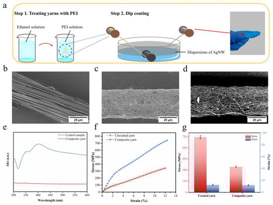 The stability of the coating was investigated using UV spectra (Figure 5e). The composite yarn was first stirred in deionized water for 30 min. No peaks of AgNWs were observed, indicating that the nanowires were firmly adsorbed on the surface of the yarn and that the coating exhibited excellent stability. The mechanical properties were evaluated using tensile stress versus strain measurements (Figure 5f). The stress of the composite yarn was found to be 343 MPa, which is less than that of the uncoated yarn (Figure 5g). It was postulated that the coating of AgNW on the surface of the composite yarn increased the number of weak knots on the yarn surface, which decreased the stress.