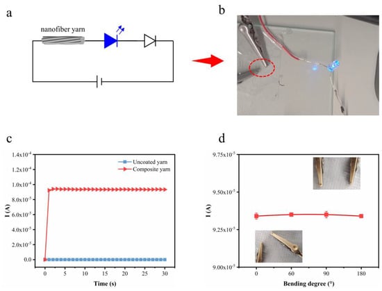 (a) Circuit diagram when the yarn is used as an element. (b) Photo showing LED light at 3 V using composite yarn as a conductive element. (c) Current–time curves of uncoated yarn and composite yarn. (d) Current of uncoated yarn and composite yarn versus the bending degree from 0° to 180°. Pictures of the bending process have been inserted.