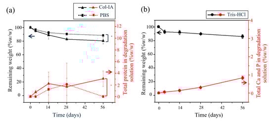 ), at pH 7.4 and 37 °C, according to ISO 10993-13. (b) Remaining weight of particles and total calcium (Ca) and phosphorus (P) in degradation solution (TRIS-HCI buffer solution