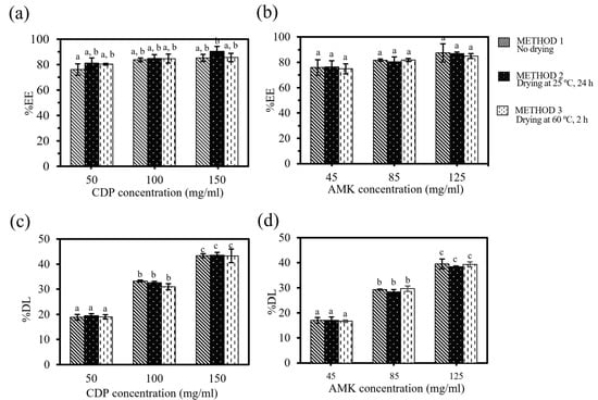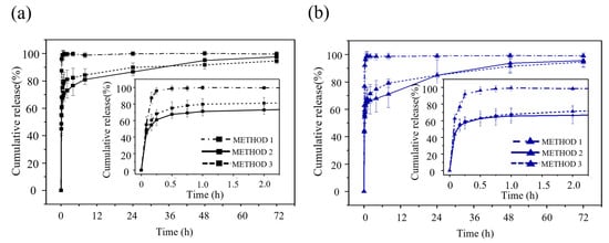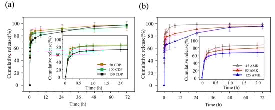 3.4. In Vitro Drug Release of CDP or AMK from the Particles
