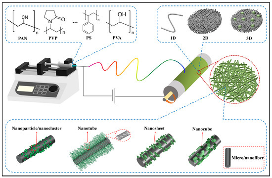 Generally, electrospinning has clear merits to prepare electrocatalytic materials. Firstly, it is simple and controllable, allowing for the rapid production of large quantities of micro/nanofibers with tunable components; whereas traditional particle or bulk catalyst materials require complex and long preparation processes. Secondly, electrospun micro/nanofibrous materials show good conductivity after a heat treatment, and the high conductivity ensures a fast electron transfer and accelerates reaction kinetics. Notably, under the premise of selecting appropriate components, electrospinning can produce self-supporting fiber membranes with porous structure, which can facilitate the electron migration and the exposure of catalytically active sites. The structure can also compensate for the poor inherent conductivity of some active components. Lastly, electrospun micro/nanofibrous electrocatalysts possess excellent structural tunability, allowing integration of different configurations, ranging from one-dimensional (1D) to three-dimensional (3D). Through a rational structural design, rich pore channel structures and core-shell architectures can be constructed within electrospun micro/nanofibers, laying the physical foundation for enhancing the catalytic activity and efficiency of catalytic materials. Additionally, the diversities of polymer matrices available for preparing electrospun micro/nanofiber-based electrocatalytic materials offer various choices. Common polymers include polyacrylonitrile (PAN), polyvinylpyrrolidone (PVP), polystyrene (PS), polyvinyl alcohol (PVA), providing a potential for designing and preparing a large range of electrospun micro/nanofiber-based electrocatalytic materials. The advantages of electrospinning technology for preparing electrocatalysts are briefly summarized as shown in Figure 2.