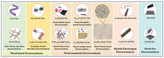 In recent years, electrospinning technology has made significant progress in the preparation of electrocatalysts for electrocatalytic water splitting, especially for HER. Electrocatalysts produced by traditional synthetic methods that are large, and prone to agglomeration, lead to apparent issues with dispersibility and utilization. Electrospun micro/nanofibers used as a catalyst support not only enhance the dispersibility of catalyst but improve catalytic efficiency [83]. Moreover, by integrating additional processes, it is easy to regulate the morphology, structure, composition, and electrical conductivity of the electrospun micro/nanofiber-based electrocatalysts to modulate their catalytic activity and stability [57]. Additionally, the electrospinning process is beneficial for expanding the diversity of electrocatalysts. Normally, electrospun micro/nanofiber-based electrocatalysts for HER based on their composition can be classified into the following categories: metal-based electrospun catalysts, metal-free based electrospun electrocatalysts, and combinations of several electrospun electrocatalysts (Figure 3).