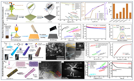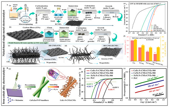 (A) (a,b) Comparison of preparation process of electrocatalysts: (a) ECNFs and 3D-Ni/CNFs/ECNFs, and (b) 3D-Ni/CNFs/CFs. (c,d) The diagram of final structure for samples: (c) 3D-Ni/CNFs/CFs and (d) 3D-Ni/CNFs/ECNFs. (e,f) Evaluation of HER performance of virous samples in 1 M KOH: (e) LSV curves, (f) Tafel slopes and overpotentials at a current density of 10 mA cm−2. (Reprinted with permission from Ref. [123], Copyright 2021, Elsevier). (B) (a) The fabrication process of CoFe-N-CNTs/CNFs. (b,c) HER electrocatalytic activities of different electrocatalysts in 1.0 M KOH: (b) LSV curves, (c) Tafel plots. (Reprinted with permission from Ref. [124], Copyright 2021, Elsevier).