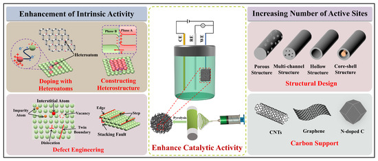 Current strategies to enhance the intrinsic activity of electrocatalysts mainly include constructing heterostructures, doping with heteroatoms, and defect engineering. The number of active sites can also be increased by adjusting the electrocatalyst’s structure. It is noteworthy that enhancements in intrinsic activity and the increase in the number of active electrocatalytic sites of electrocatalyst are not isolated events. They can be simultaneously improved with a rational design. The strategies related to Table 2 can achieve the micro/nano structural regulation and surface performance enhancement of electrocatalysts, leading to ideal electrocatalytic performance.