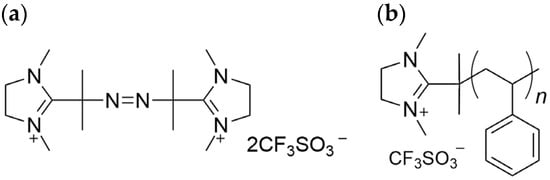 In recent years, polymerization initiators that impart functionality to polymers have gained attention as an important research area. These initiators provide functions such as grafting onto surfaces and molecular orientation within polymer matrices, enabling unique applications like biomedical science. For example, studies have been conducted using cholesterol-based modifiers to form graft coatings with amino groups on glass surfaces to control the orientation of liquid crystals and utilizing halogen bonding between perfluoroalkyl iodides and amines to develop efficient synthesis methods for fluorine-containing polymers [23,24]. In a previous study, we demonstrated that thermally pressing polystyrene synthesized with the cationic radical polymerization initiator 2,2′-azobis-[2-(1,3-dimethyl-4,5-dihydro-1H-imidazol-3-ium-2-yl)] propane triflate (ADIP; Figure 1a) produces a resin with an antibacterial surface [25]. ADIP, an azo polymerization initiator with imidazolium-based quaternary ammonium groups, incorporates cationic groups at the polymer chain ends during polymerization, giving the material antibacterial properties [26]. In the case of ADIP-polymerized polystyrene (ADIP-PS; Figure 1b), these cationic groups align on the resin surface, resulting in contact-killing antibacterial activity [25]. However, ADIP-PS has drawbacks, such as reduced transparency and strength compared to PS synthesized using a general polymerization initiator.