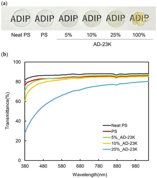 The transparency of ADIP-PS sheets was assessed using a transmittance measurement device. The highest-yield sample, AD-23K, was blended with GPPS at various ratios and molded into sheets. Figure 3a shows the sheets having the thicknesses listed in Table 3. “Neat PS” refers to sheets formed from virgin GPPS pellets, whereas “PS” refers to sheets formed from GPPS pellets after heat blending. Sheets made solely from ADIP-PS (100% AD-23K) were brittle and unsuitable for forming the 2 cm diameter sheets required for transparency evaluation. Other sheets were successfully molded to a uniform thickness of 1.9 mm.