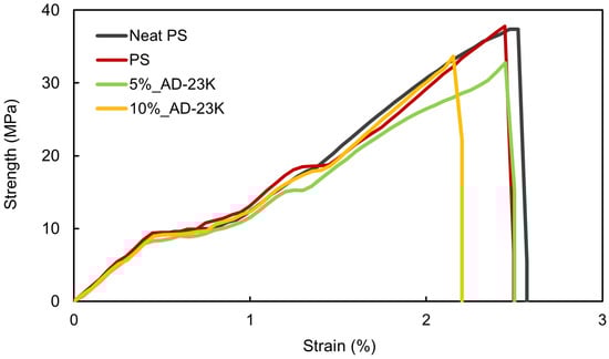 Stress–strain curves of PS and ADIP-PS (AD-23K) resins.