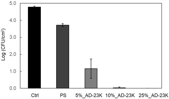 Antibacterial activity of ADIP-PS (AD-23K) sheets with different ratios against S. aureus. Error bars represent the standard deviation (SD) with n = 3.
