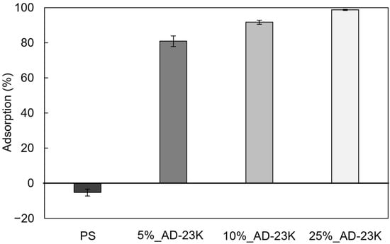 Polymer compatibility is affected by chemical structure, molecular weight, polarity, and crystallinity [42]. To evaluate whether ADIP-PS with different molecular weights could maintain antibacterial activity when blended with GPPS, we prepared sheets using 10% blends of AD-15K and AD-40K and assessed their antibacterial properties. AD-15K, which has a lower molecular weight than AD-23K, exhibited similar antibacterial activity to AD-23K, whereas AD-40K, which has a higher molecular weight, also showed strong antibacterial effects (Figure 7). To determine the density of cationic groups on the sheet surfaces, we measured TNS adsorption. AD-15K, which had the highest antibacterial activity, also displayed the highest TNS adsorption rate, whereas AD-40K, with slightly reduced antibacterial activity, showed relatively lower TNS adsorption (Figure 8). This suggests a direct correlation between antibacterial efficacy and cationic group density. Within the tested molecular weight range, blending ADIP-PS with GPPS did not significantly affect antibacterial activity.