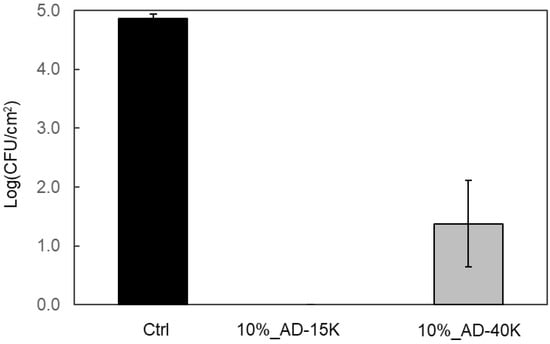 Antibacterial activity was evaluated following the ISO 22196:2011 standard [33], which measures antibacterial activity on plastic surfaces against Staphylococcus aureus (NBRC12732). Polyethylene sheets, which do not have antibacterial properties, were used as controls. S. aureus was cultured for 24 h on standard agar medium (5 g/L meat extract, 10 g/L peptone, 5 g/L NaCl, and 15 g/L agar). Colonies were then suspended in 1/500-diluted nutrient broth to achieve a bacterial concentration of 2.5–10 × 105 colony forming units (CFU). This solution was applied to the reference and test PS samples, which were incubated at 35 °C for 24 h in 90% humidity. Samples were washed with soybean–casein-digest–lecithin–polysorbate medium (10 mL), serially diluted (10×, 102×, 103×, and 104×), and 1 mL of each dilution was plated on standard agar. After solidification, the agar plates were incubated at 35 °C for 40–48 h, and colonies were counted to calculate log (CFU/cm2). When the colony counts were zero, the log (CFU/cm2) was set to 0.05 for convenience.