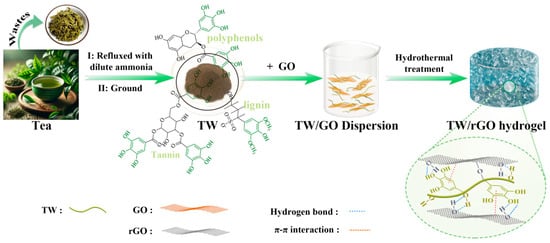 2.2. Preparation of Tea Waste/Reduced Graphene Oxide Hydrogel