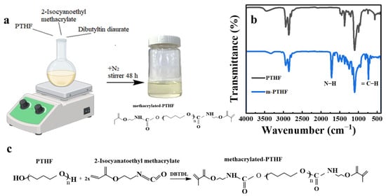 The modification of hydroxy-terminated poly(tetrahydrofuran) (Mn ≈ 1000) was carried out following reported methods [20]. Initially, 12 g of hydroxyl-terminated PTHF was melted at 60 °C and dissolved in 35 mL of dichloromethane (DCM) by stirring in a round-bottom flask. Then, 2-isocyanatoethyl methacrylate was added to the PTHF solution in a 2:1 molar ratio, along with 0.06 mol% dibutyltin dilaurate as a catalyst. The reaction was maintained under vigorous stirring at room temperature (RT) for 48 h. Afterward, the excess DCM was removed using a rotary evaporator at 38 °C under a pressure of 400 mbar. The final product was then purified by precipitation in cold acetone followed by cold ether. The resulting methacrylated polytetrahydrofuran (mPTHF) was a viscous liquid at room temperature.