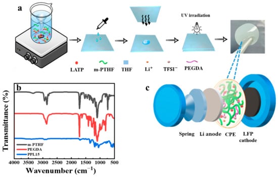 Figure 3. Scheme of CPE synthesis (a); FTIR Spectroscopy on polymer (α-methacrylated PTHF), PEGDA, CPE (b); structure of coin cell (c).