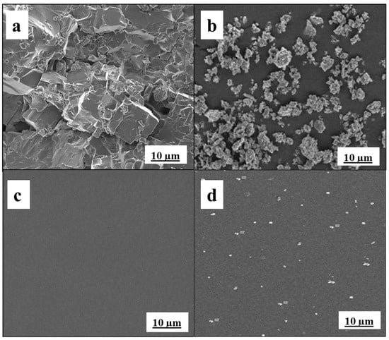 The morphology of the m-PTHF and LATP-based films was analyzed using SEM, as shown in Figure 4. The microstructure of the LATP pellet and powders is shown in Figure 4a,b, respectively. The milling process standardizes the particle size distribution of the synthesized powder, leading to a uniform microstructure free of clustered pores or large grains. To prevent crack formation and maintain high ionic conductivity, it is crucial to avoid grain growth in the LATP microstructures, which can be influenced by the an-isotropic thermal expansion along the different crystallographic axes of the LATP structure. Notably, increasing the sintering temperatures from 800 to 950 °C for the milled powder does not cause any cracking [39]. Representative images of the films containing 0 wt% and 15 wt% LATP are given in Figure 4c,d, respectively. The results reveal a consistently smooth and uniform surface morphology across all polymer film samples without LATP (Figure 4c). Importantly, there is no evidence of agglomerated lithium salt particles, indicating that the lithium salt is effectively dissolved and uniformly integrated into the polymer structure. This uniform dispersion is essential for achieving consistent ionic conductivity and optimizing the overall performance of the composite solid polymer electrolyte [42]. Notably, the PPL15 film (containing 15 wt% LATP) demonstrates excellent compatibility with LATP particles evenly distributed throughout the polymer matrix. From the SEM images of the PPL15 composite polymer electrolyte containing 15% LATP particles, white crystals can be observed, corresponding to the LATP ceramic particles. This distribution is consistent with findings in other published works and demonstrates a homogeneous distribution of ceramic particles throughout the polymer matrix [43,44]. The thickness of the resulting CPE films ranged between 60 and 70 µm, ensuring uniformity across the samples.