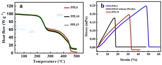 Figure 5. TGA of PPL CPEs (a); stress-strain curves of PPL CPEs (b).