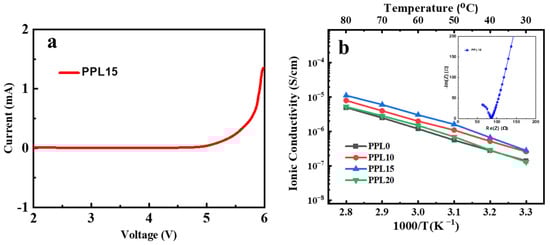 Figure 6. LSV curve of PPL15 CPE (a); Arrhenius plots for PPL CPEs with different LATP content (b).