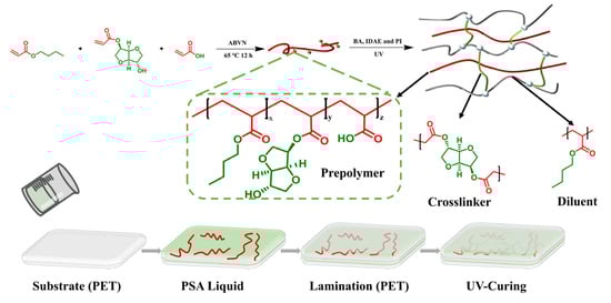 Isosorbide has also been employed to prepare bio-based PSAs. Jame et al. used isosorbide as a raw material to develop bio-based acrylic PSA through RAFT polymerization [37]. However, this adhesive was non-crosslinked and prone to aging, yellowing, and a loss of adhesion, resulting in a shorter service life than crosslinked adhesives. Baek et al. produced a bio-based PSA with isosorbide via UV-curing using a bifunctional and petrochemical-based crosslinking agent, which reduced the biomass content of the adhesive [38]. Additionally, a waterborne PSA was prepared using isosorbide methacrylate monomers through emulsion polymerization. However, its poor mechanical properties limited its application scope [39]. Although these findings successfully extend the application of isosorbide to PSAs, the limitations mentioned previously persist.