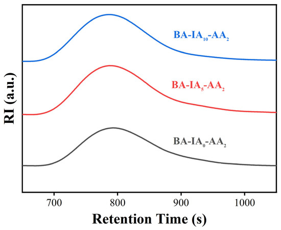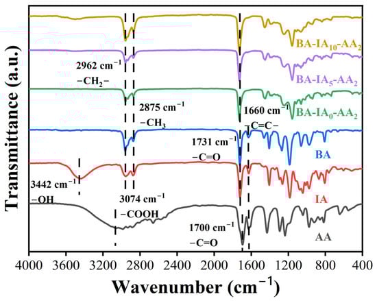 The chemical structures of the prepolymers were confirmed via NMR spectroscopy. As shown in Figure 3, the characteristic peak of IA appears in the NMR spectrum of the prepolymer, whereas the characteristic peak of vinyl disappears, indicating that the prepolymer was synthesized with a high conversion rate. The molecular weights and distributions were determined via GPC, as detailed in Table 1 and Figure 4. The molar quantity of the initiator (ABVN) remains constant throughout the study, resulting in a prepolymer with a relatively high molecular weight and a uniform molecular weight distribution (Table 1). FTIR spectroscopy has been widely used to confirm the chemical structure of adhesives [44,45,46]. As shown in Figure 5, in the spectrum of IA, a distinct −OH absorption band appears at 3442 cm−1. For AA, the absorption peaks corresponding to −COOH and −C=O are identified at 3074 cm−1 and 1700 cm−1, respectively. Additionally, absorption peaks at 2692 cm−1 and 2875 cm−1 are attributed to the −CH2− and −CH3 groups in the prepolymers BA and IA, respectively. Characteristic peaks for the −C=O groups appear at 1731 cm−1 in both prepolymers BA and IA. Notably, the C=C peaks around 1660 cm−1 shown in BA, AA, and IA monomers are absent from the spectra of the prepolymers, indicating that these monomers underwent copolymerization with a high conversion rate.