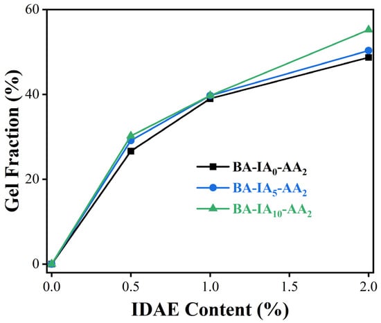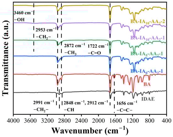 In this study, several acrylic PSAs exhibit crosslinked structures. In addition, the crosslinking degree significantly influences the adhesion performance of PSAs. The UV-curing samples were analyzed via FTIR. As shown in Figure 6, in the crosslinked samples, the absorption peaks of −OH, −CH2−, CH3, and −C=O appear at 3460 cm−1, 2953 cm−1, 2872 cm−1, and 1722 cm−1, respectively. The absence of C=C peaks for both the crosslinker (IDAE) and the diluent (BA) is consistent with the reaction of BA with IDAE’s C=C, indicating that crosslinked networks are formed in the presence of the photo initiator.